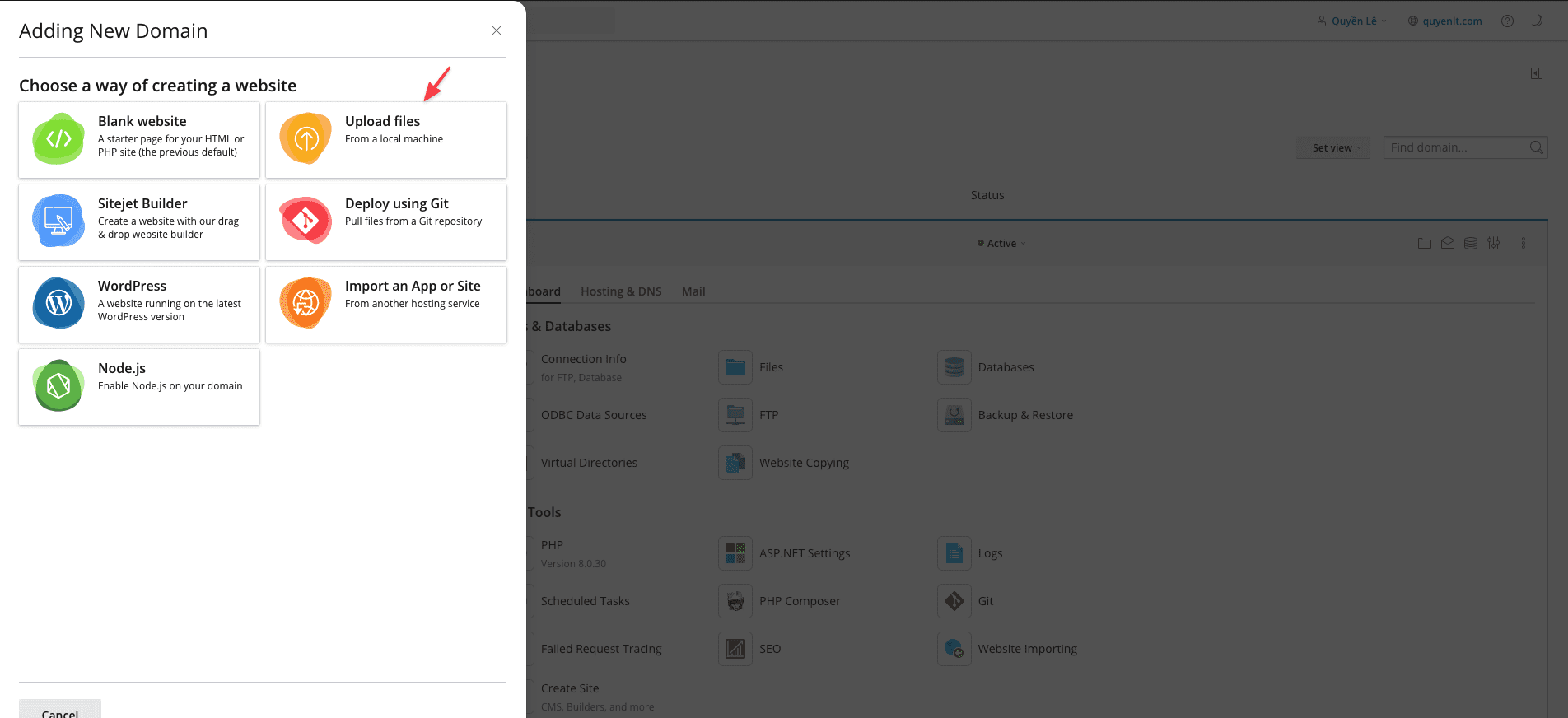 Ở đây bạn Chọn cách tạo trang web , tuỳ vào nhu cầu của mọi người , nếu chưa xác định được loại mã nguồn website đang sử dụng bạn có thể chọn Upload files nhé.