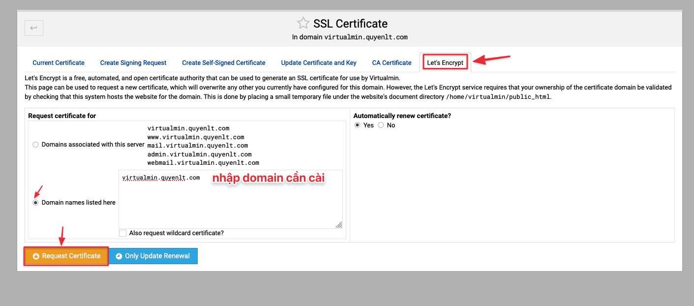 Ở đây các bạn chọn qua phần “Let’s Encrypt” tích vào “Domain names listed here” sau đó nhập domain cần cài .