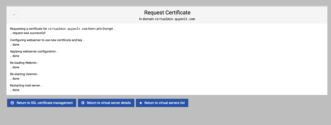 Nhấn “Request Certificate” để bắt đầu cài đặt, Let’s Encrypt sẽ bắt đầu quá trình xác thực và cài đặt tự động. Khi quá trình hoàn tất, bạn sẽ nhận được một thông báo về việc cài đặt SSL thành công.