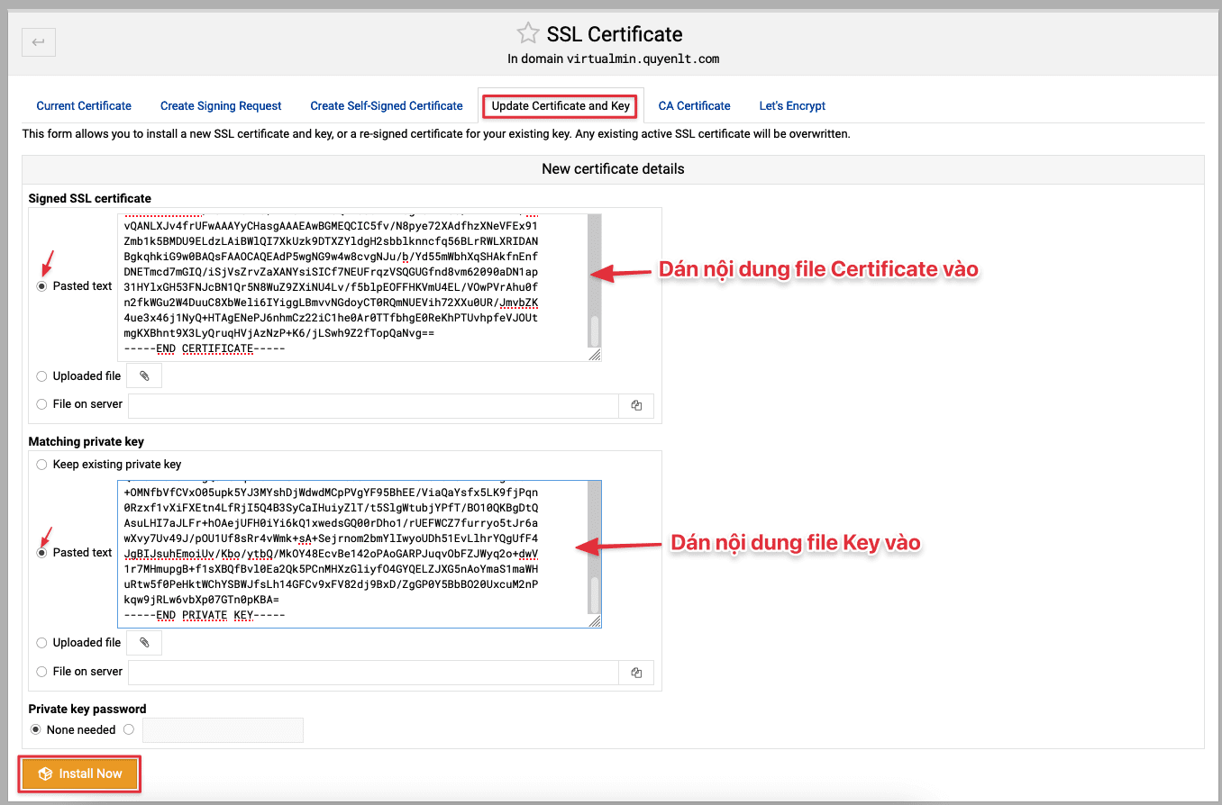 Ở đây bạn chọn vào “Update Certificate and Key” để gắn file Certificate và file Key lên nhé và nhấn “Install Now” để lưu nhé.