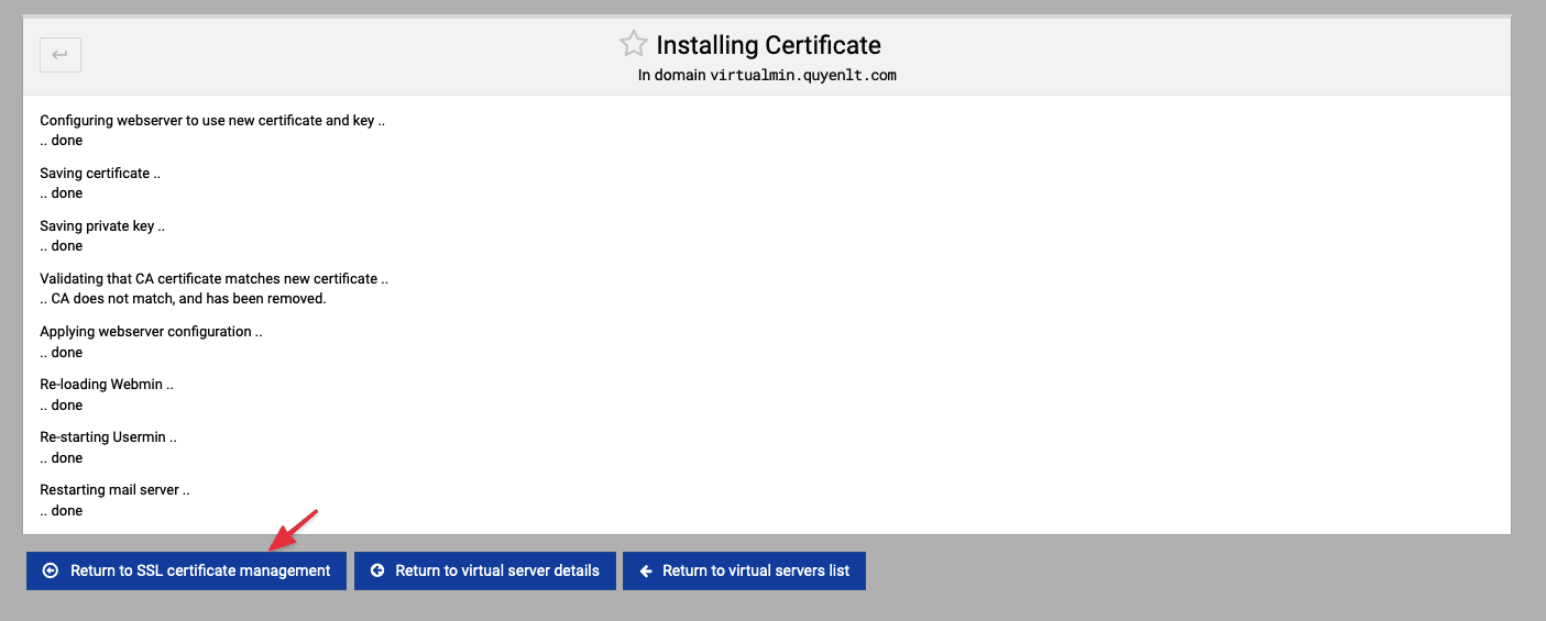 Khi quá trình hoàn tất, bạn sẽ nhận được một thông báo về việc cài đặt SSL thành công, tuy nhiên vẫn chưa hoàn tất, tiếp theo bạn bấm vào “Return to SSL certificate management“