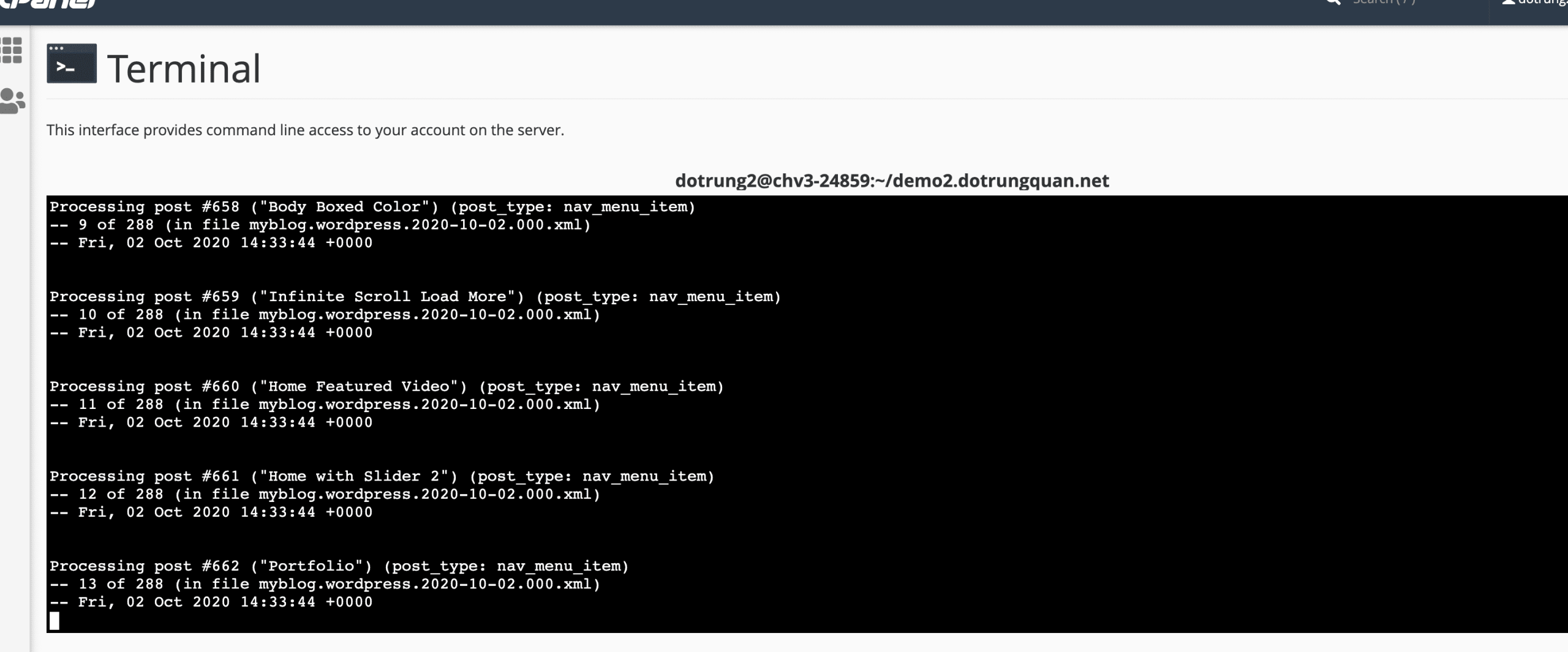 cd demo2.dotrungquan.net wp import file-name.xml --authors=create