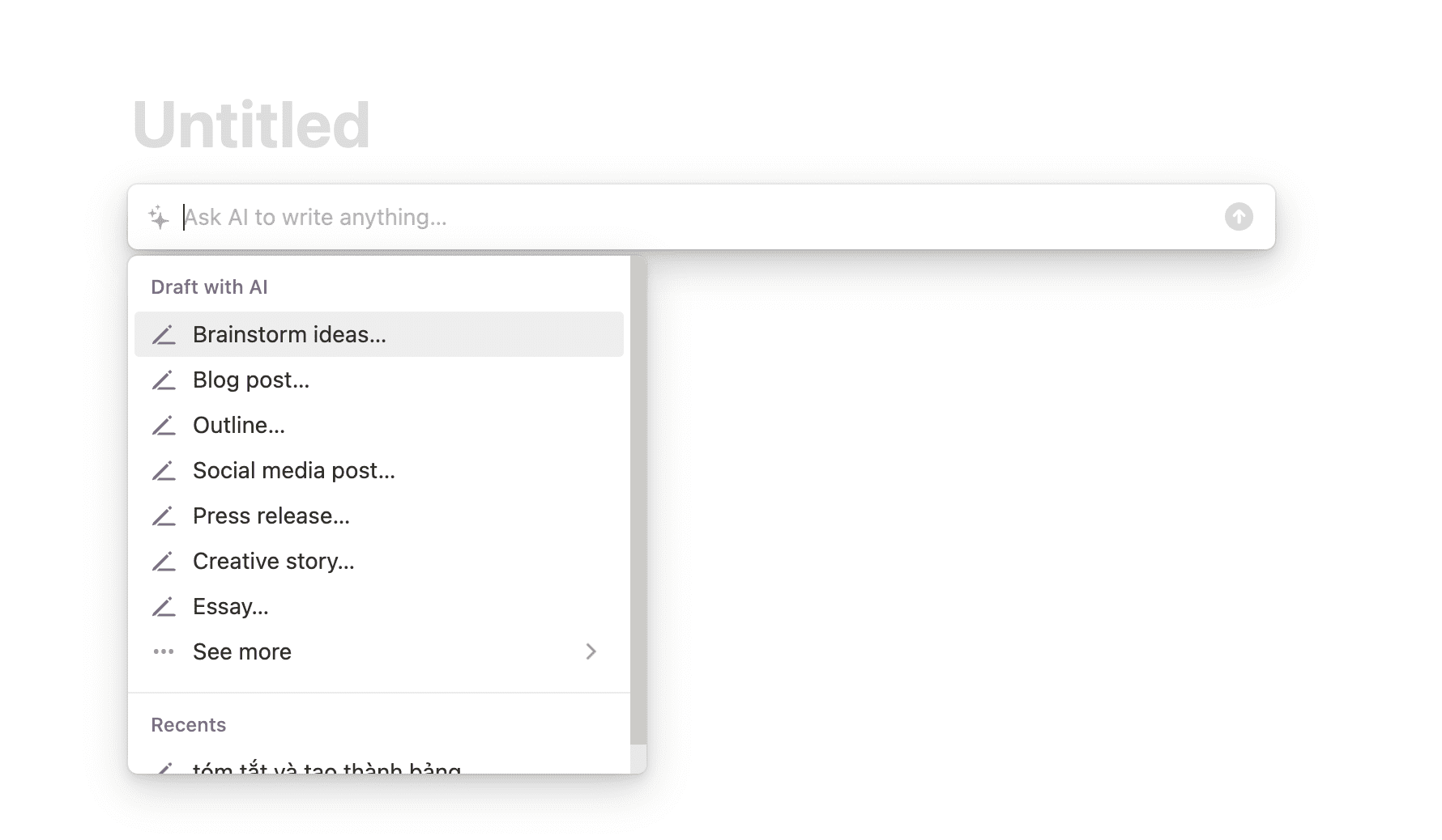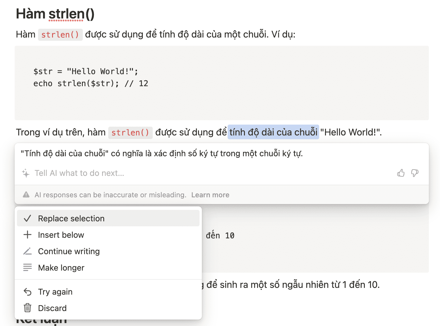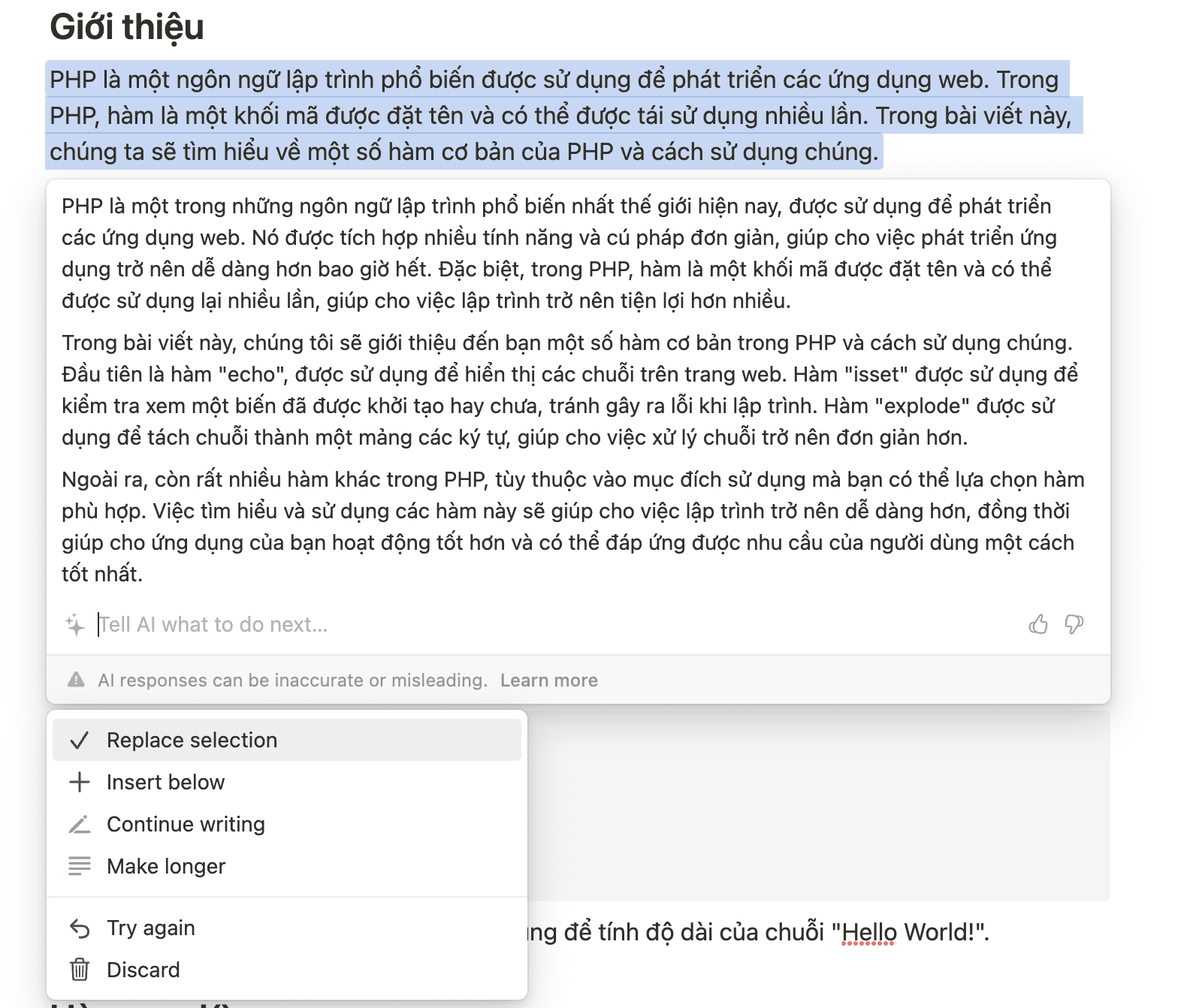 Now you can choose a feature from the dropdown menu and start using it. When Notion AI completes generating a piece of content, you can continue requesting modifications or additions within the current action. Here is a video demonstrating the use of Notion AI to compose a report on Vietnam’s GDP in 2022.
