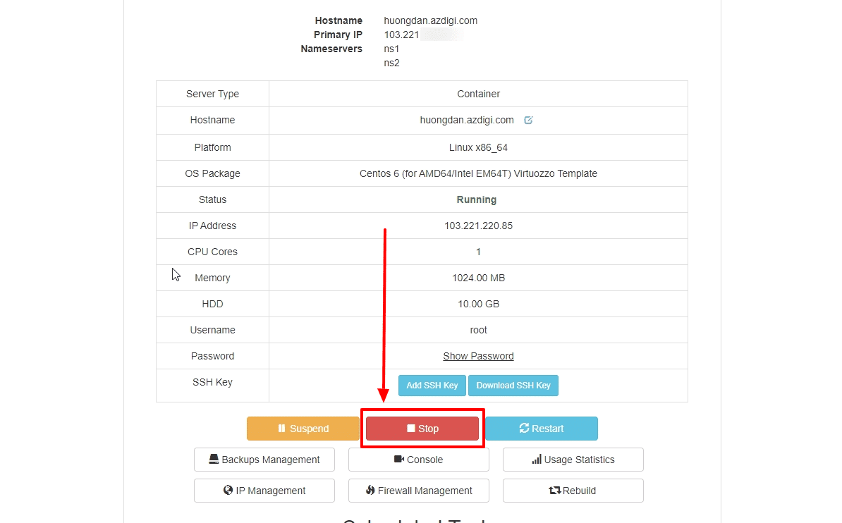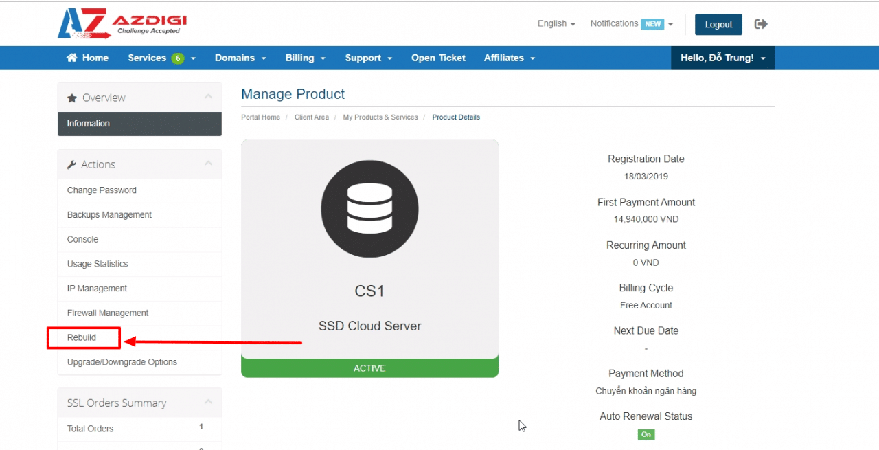 Currently, when using the Cloud Server service at AZDIGI, you have complete control over this service from basic operations such as (Stop, Start, Restart, Suspend) and go deeper. Rebuild this Cloud Server with just a few simple steps as follows.