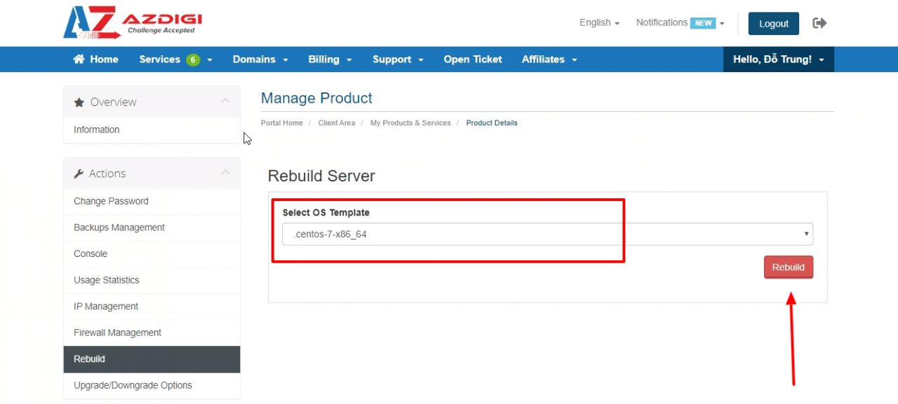 In the Select OS Template section that allows you to choose a lot of OS, you choose the OS you need to use and click Rebuild, after clicking, you wait for the system to rebuild. It will normally take about 5-7 minutes to complete.