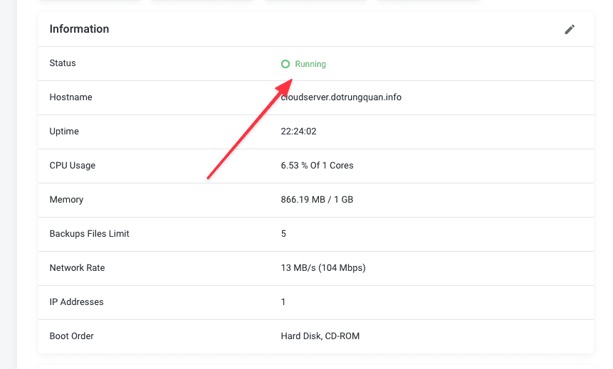 After completing the restore process, return to the server information and check that the Running status is complete.
