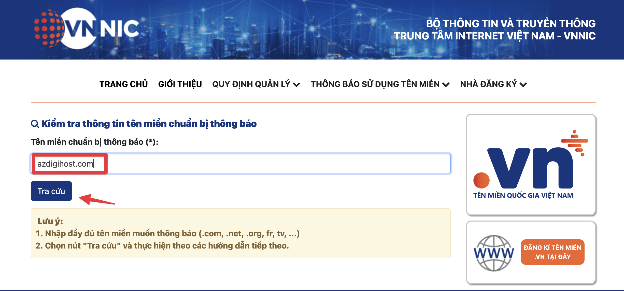 First, you access the link https://thongbaotenmien.vn/thongbaomoi.xhtml => enter the domain name to be notified to conduct the check.