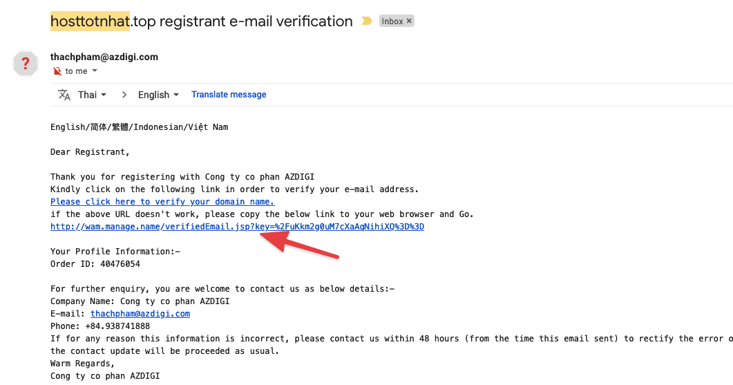 The address sent to is domain-admin@azdigi.com, with the content attached an authentication link with the domain name wam.manage.name as shown below: