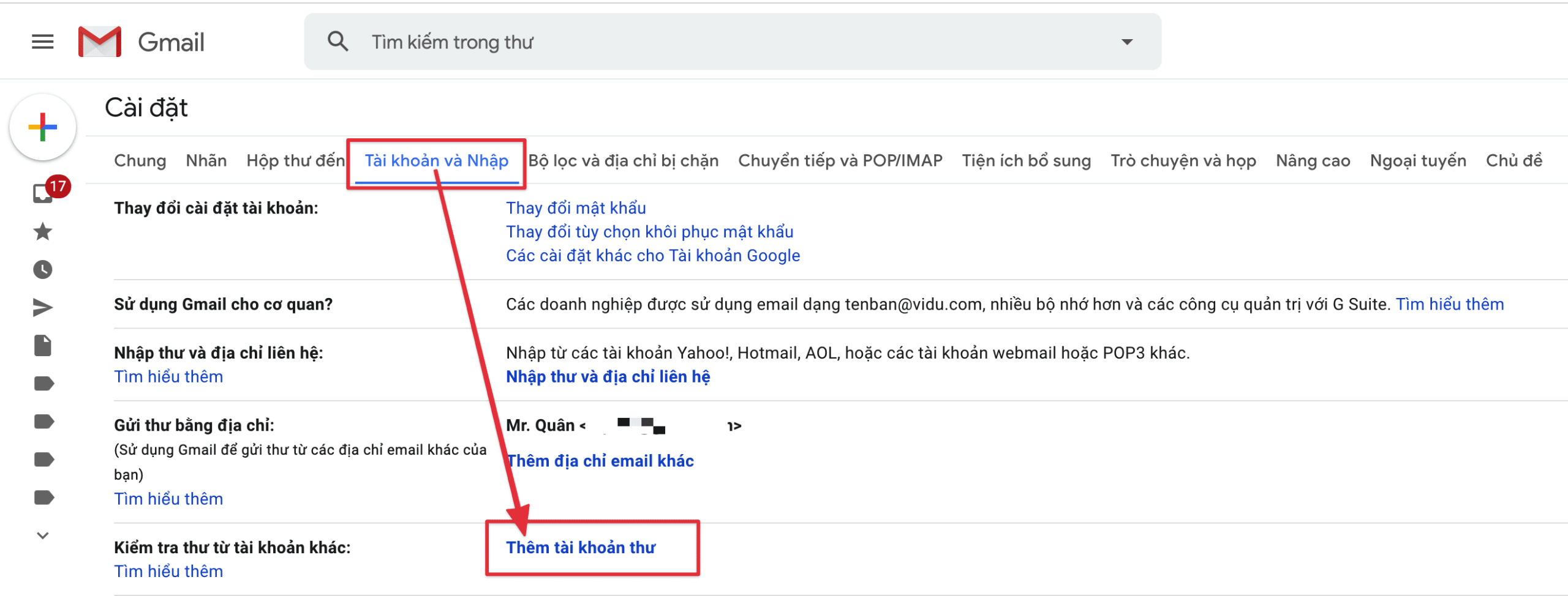 You access Gmail’s Settings, select Accounts & Import => click Add mail account as shown below: