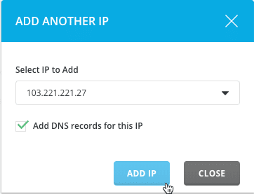 Next, choose an IP that you want to use for this domain. The number of IPs will depend on your service plan. After selecting an IP to use, you make sure to tick on the Add DNS records for this IP box and press the ADD IP button to add the domain name.