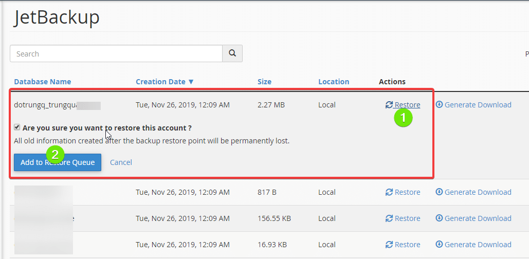 In this section will show your full database, you need to choose the exact database name of that website and the corresponding date to restore. After determining the database to restore, press Restore => Add to Restore Queue