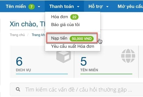 After logging in to the page https://my.azdigi.com, go to the Payment menu and select Top-up.