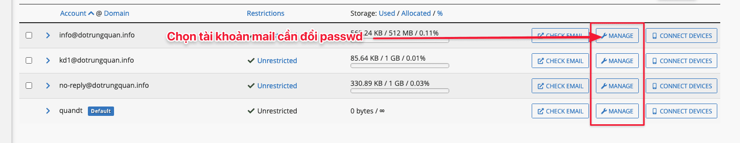 After entering the interface to manage mail accounts, select the account to change the password => selectManage