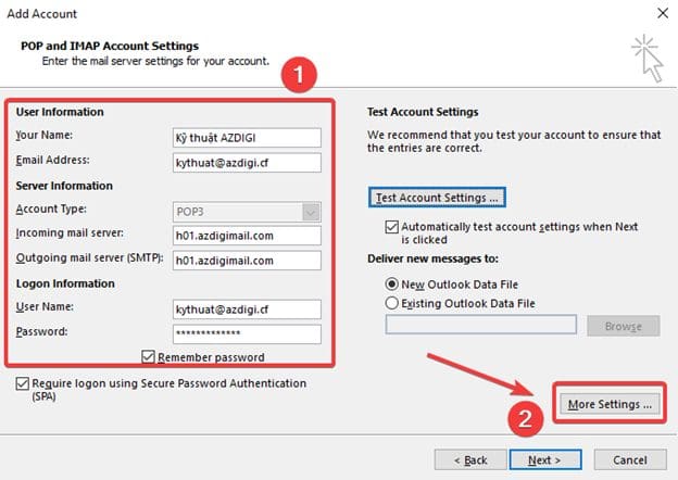 After filling in the complete and correct information in (1), click More Settings (2) to configure the Outgoing Server.