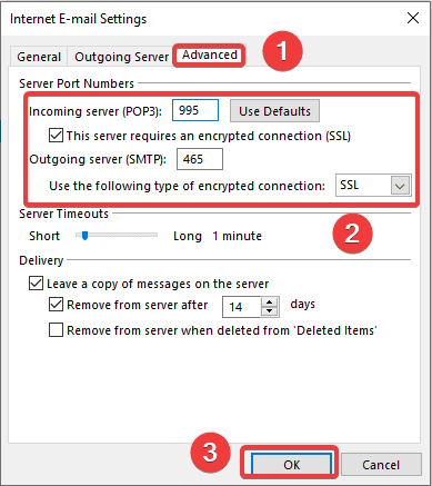- Incoming server (POP3): 995 . Tick the line “This server requires an encrypted connection (SSL)”