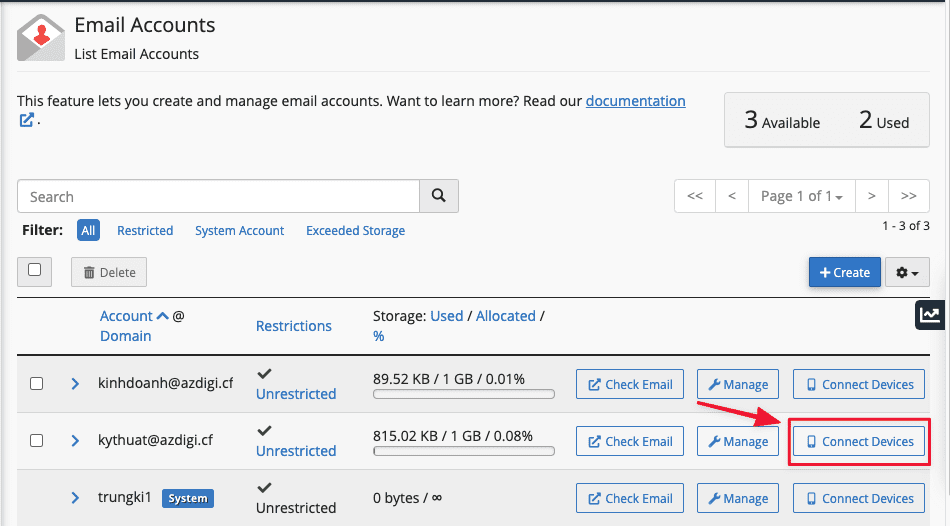 At AZDIGI, to see specific Port parameters, you log in to the AZDIGI-MAIL => Email Accounts => Connect Devices.