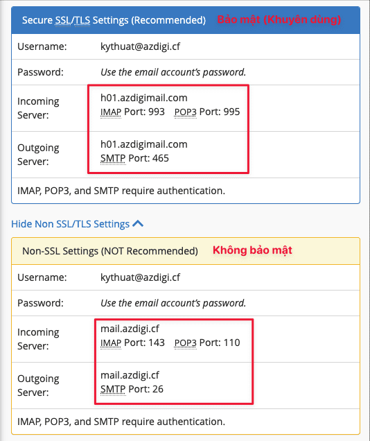 This Port configuration depends on whether your mail server supports Security certificates (SSL/TLS) so that you can follow and configure the Port correctly. Usually, paid Mail service providers in general, or at AZDIGI in particular, most of them support Security certificates (SSL/TLS ) on the mail server. Therefore, when configuring, you should choose this method to increase security.