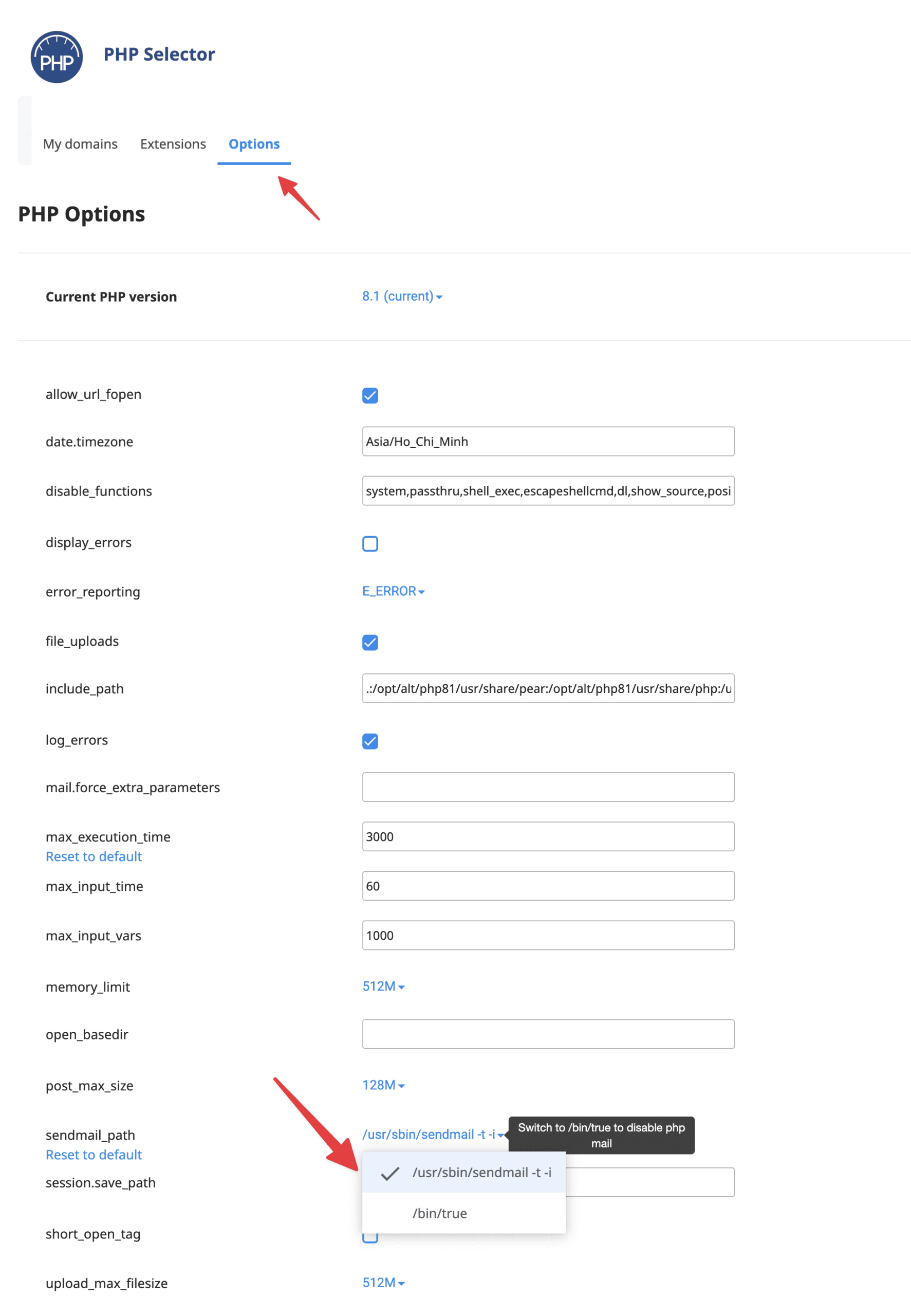 Then select the Options tab, find the itemsendmail_path and change the value to/usr/sbin/sendmail -t -i to enable sending mail.