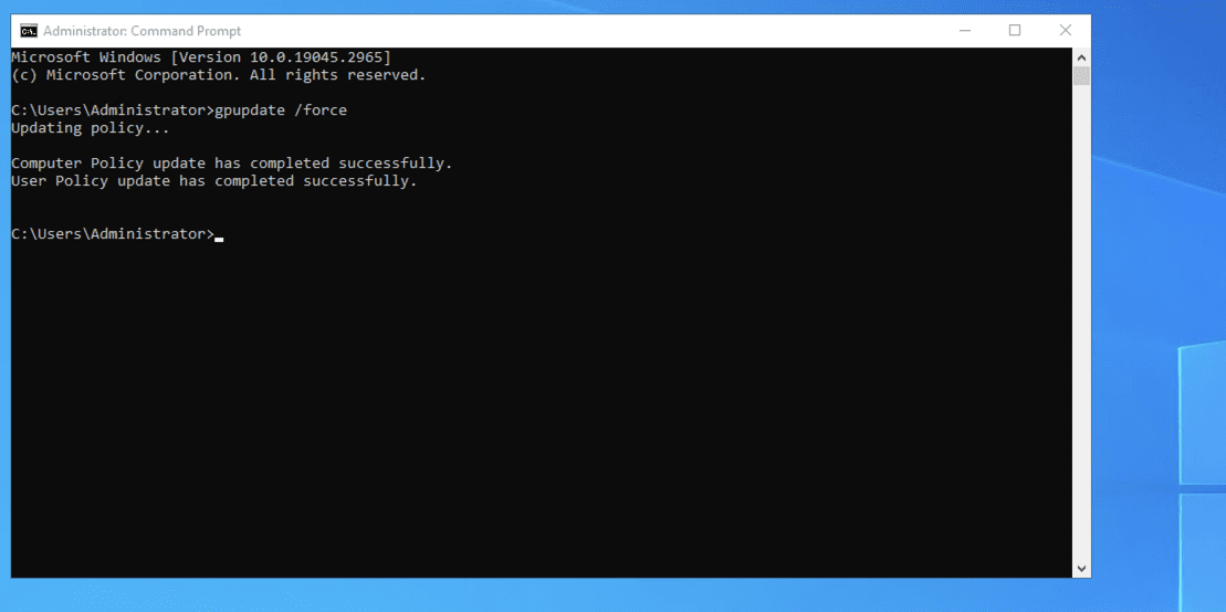 Open the “CMD” window with administrator privileges and run the following command to enforce the changes: