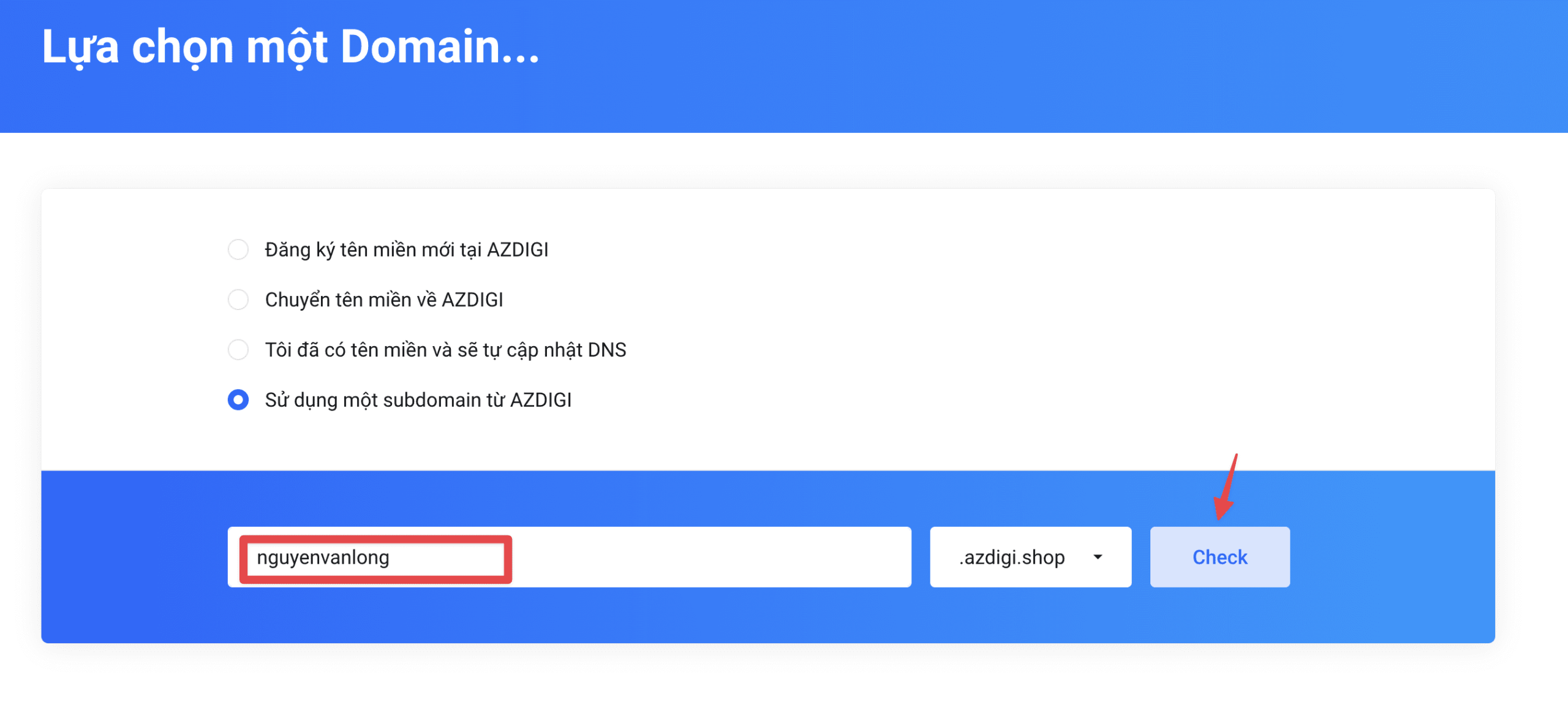 Then you choose the option to use the domain name; if you do not have a domain name, select the Use a subdomain from the AZDIGI option and enter the subdomain you want to use. If no one has used this sub-domain yet, you can proceed to use it.