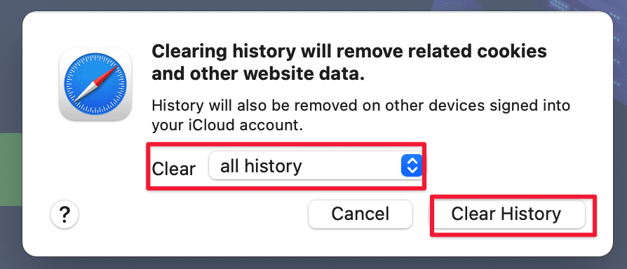 On the Safari browser, select History in the top bar menu and then select Clear History