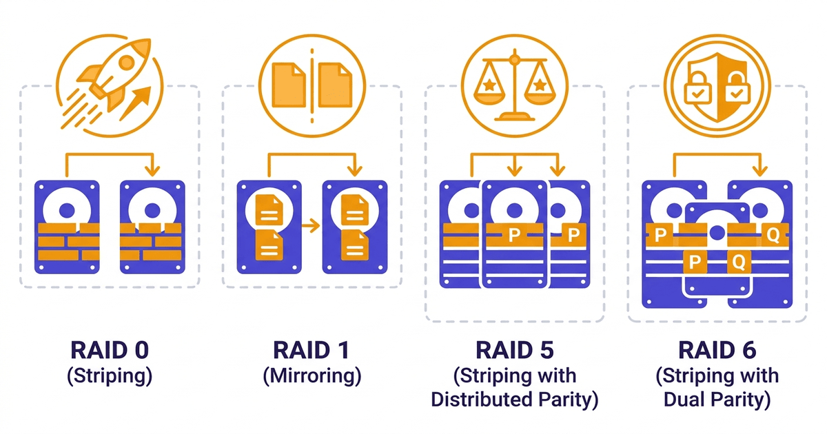Each RAID level solves a different problem. RAID 0 prioritizes speed, RAID 1 focuses on safety, RAID 5 balances both, and RAID 6 adds an extra layer of protection for large arrays.