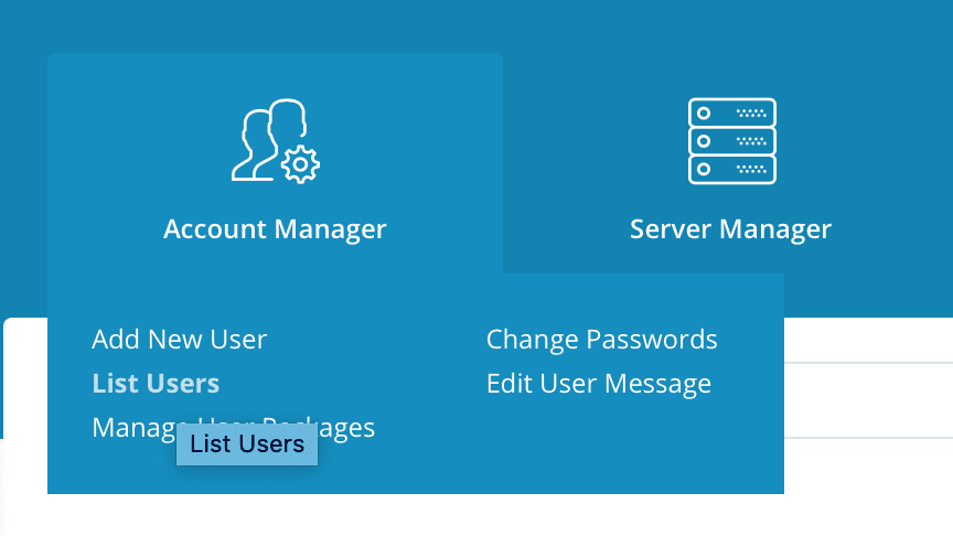 After you have selected the Reseller level, go to the Account Manager feature list => select List Users.