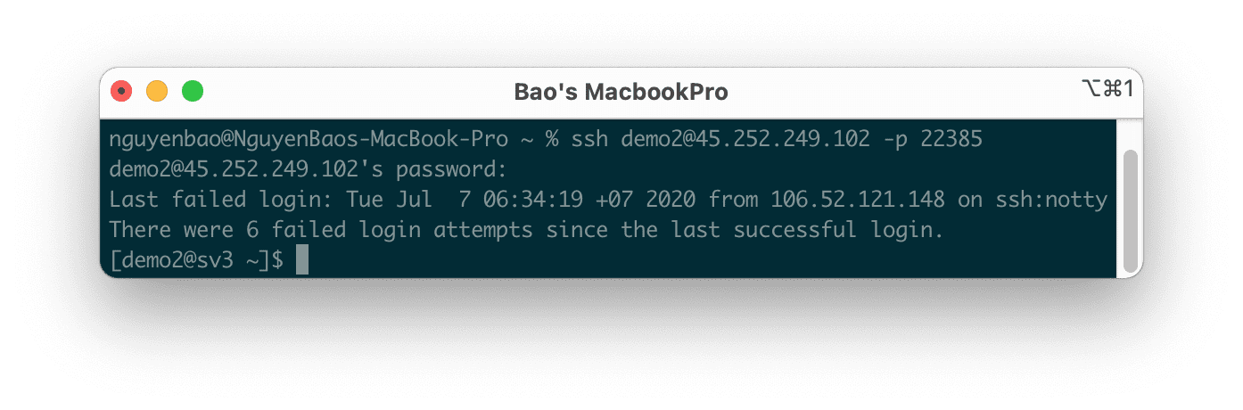 Here I have SSH successfully with user demo2. Remember to SSH with the SSH port of your server; my VPS SSH port is 22385, so I will add -p 22385 after the SSH information.