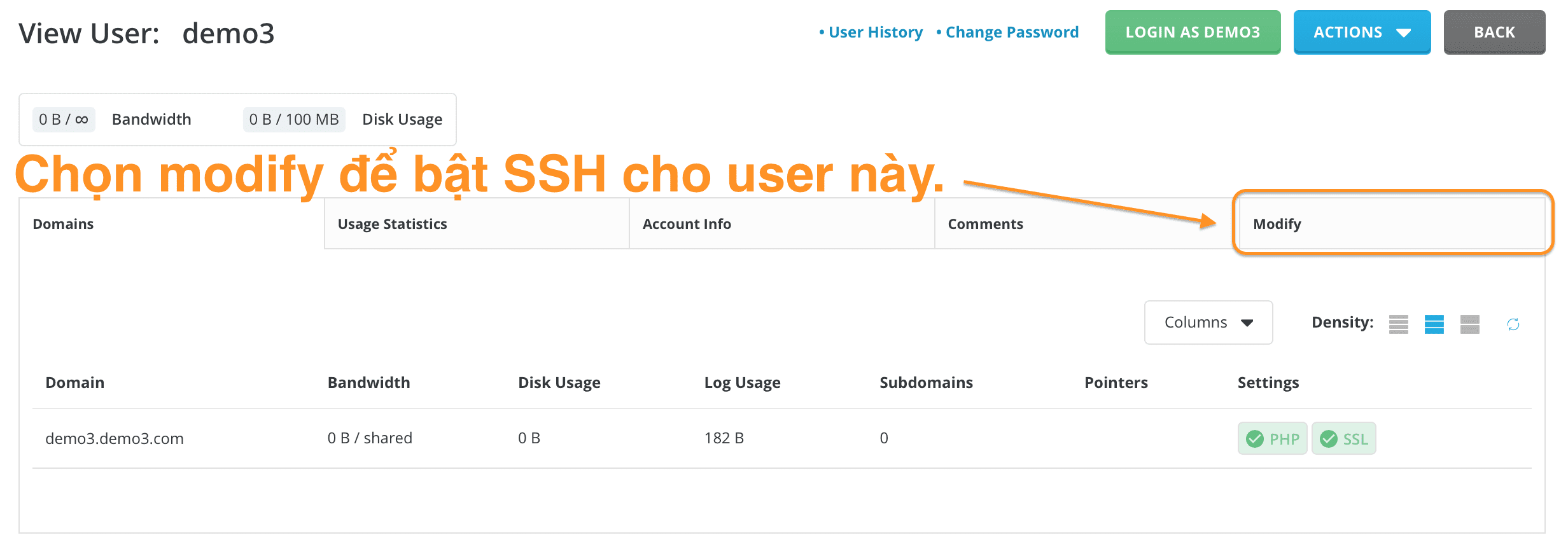 Next, you select the Resellers’ details to which you want to grant SSH permissions and manage SSH permissions of the users of these Resellers. Then select Modify as shown below: