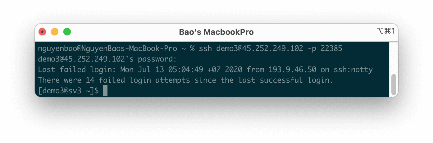 So I have SSH successfully with user demo3. Remember to SSH with the SSH port of your server; my VPS SSH port is 22385, so I will add -p 22385 after the SSH information.
