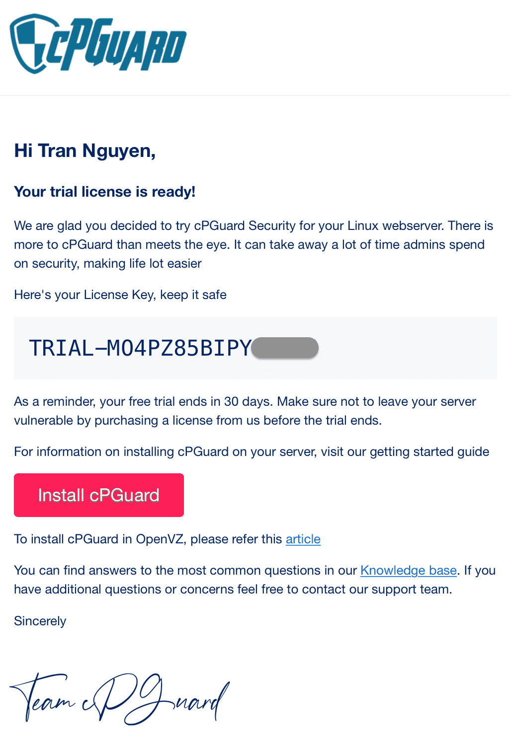 Once your cPGuard trial license is activated, you will receive an email containing the License Key, as shown below: