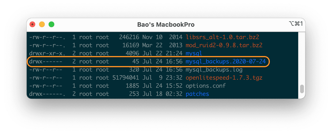 After running this command, the directory name mysql_backups will be changed to a new name of the form mysql_backups.YYYY-mm-dd as shown below: