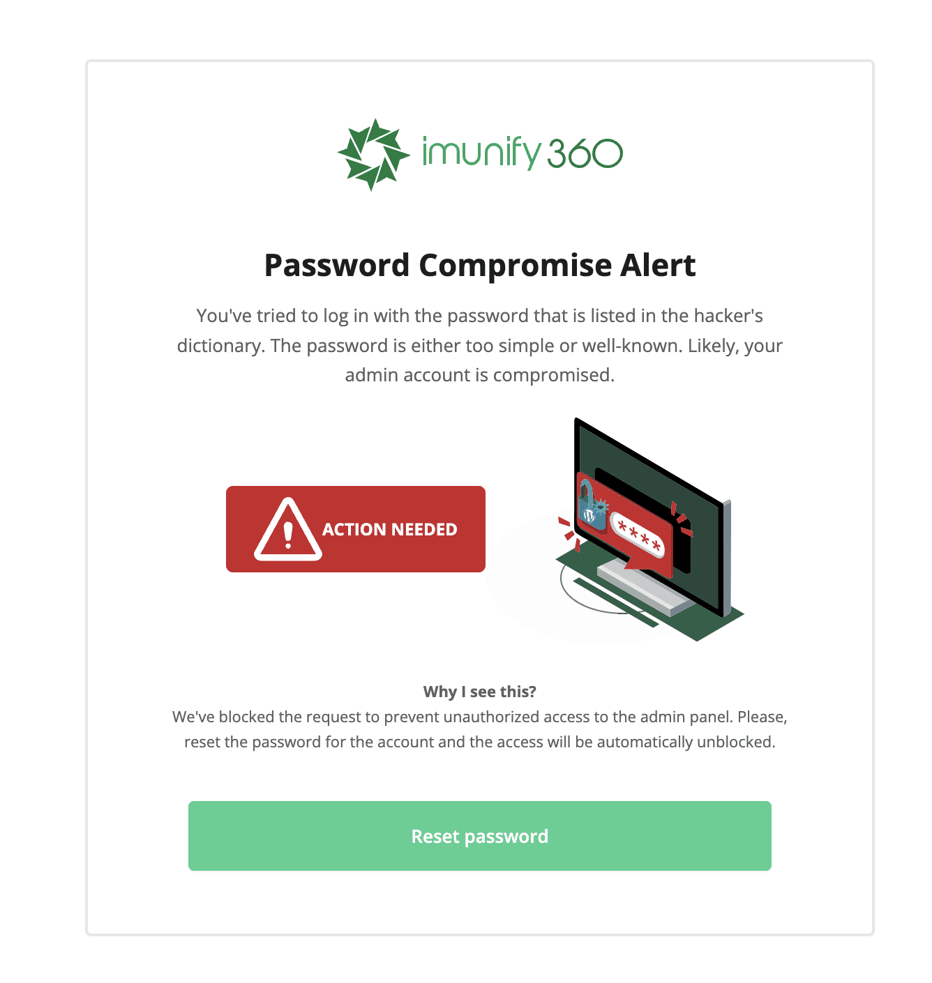 Therefore, Imunify360 has added a feature called WordPress Account Compromise Prevention to prevent the risk of webmaster account exploitation based on weak or leaked passwords.