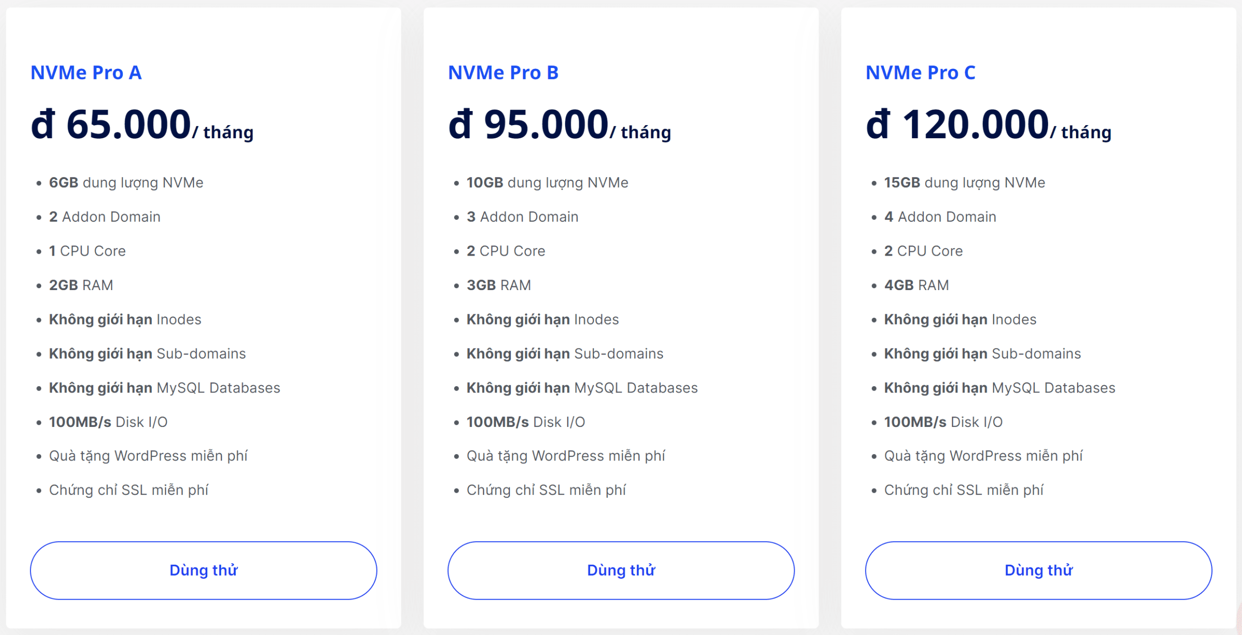 With prices starting from 65,000 Vietnamese Dong per month, customers can enjoy up to 6GB of NVMe storage with high speed. The I/O read and write speed is guaranteed at a fixed rate of 100MB/s. This is a rare specification to find in a web hosting package priced under 100,000 Vietnamese Dong per month.