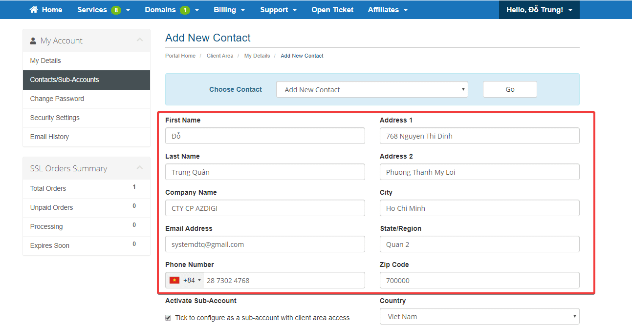 In this article, AZDIGI will guide you through adding one or more contact accounts (Contact/Sub-Account) to your main customer account. And you can customize the permissions for the added accounts according to the permissions set by AZDIGI. This function is very useful when adding multiple accounts to support the process of working and communicating with AZDIGI without going through the main email.