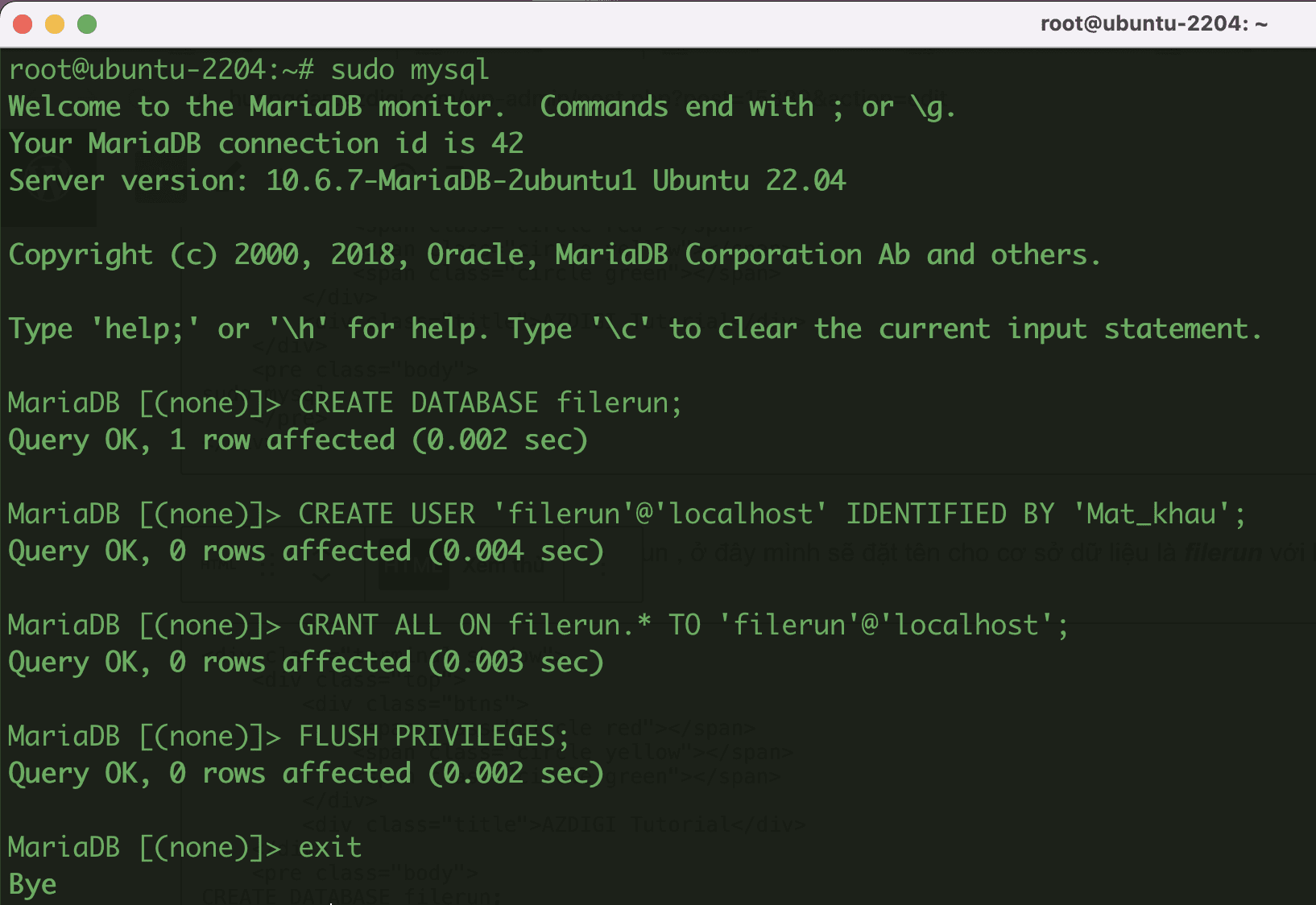 CREATE USER 'filerun'@'localhost' IDENTIFIED BY 'Mat_khau';