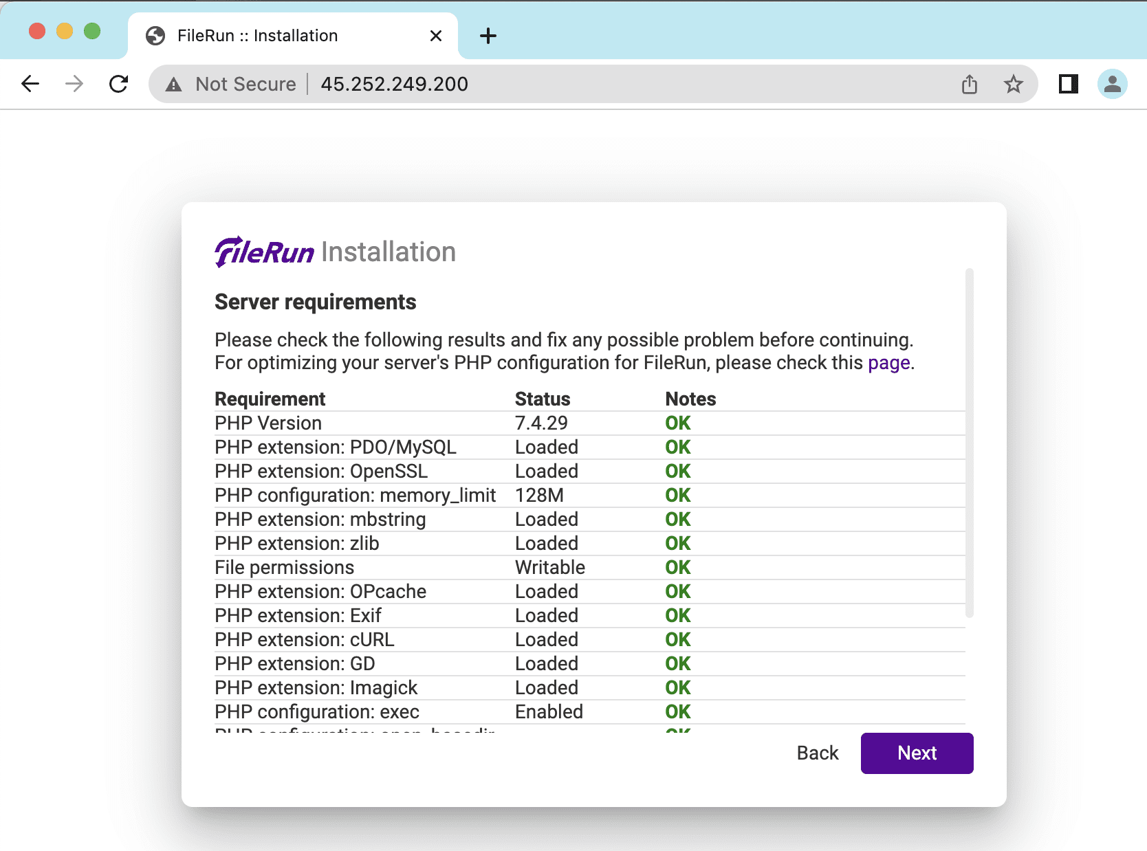 After completing the installation steps above, now go to your browser and enter your address: http://YOUR-SERVER-IP to complete the FileRun setup.