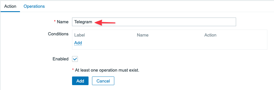 Now you need to create an Action to send notifications to Telegram. Because if you don’t create it, the system will only notify you in the Zabbix interface.