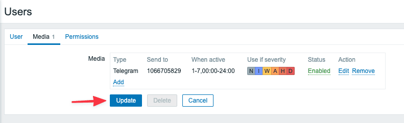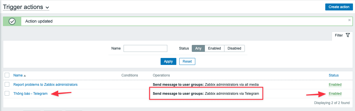 After completing the configuration, you will see Action Telegram and if the status: Enabled is done.
