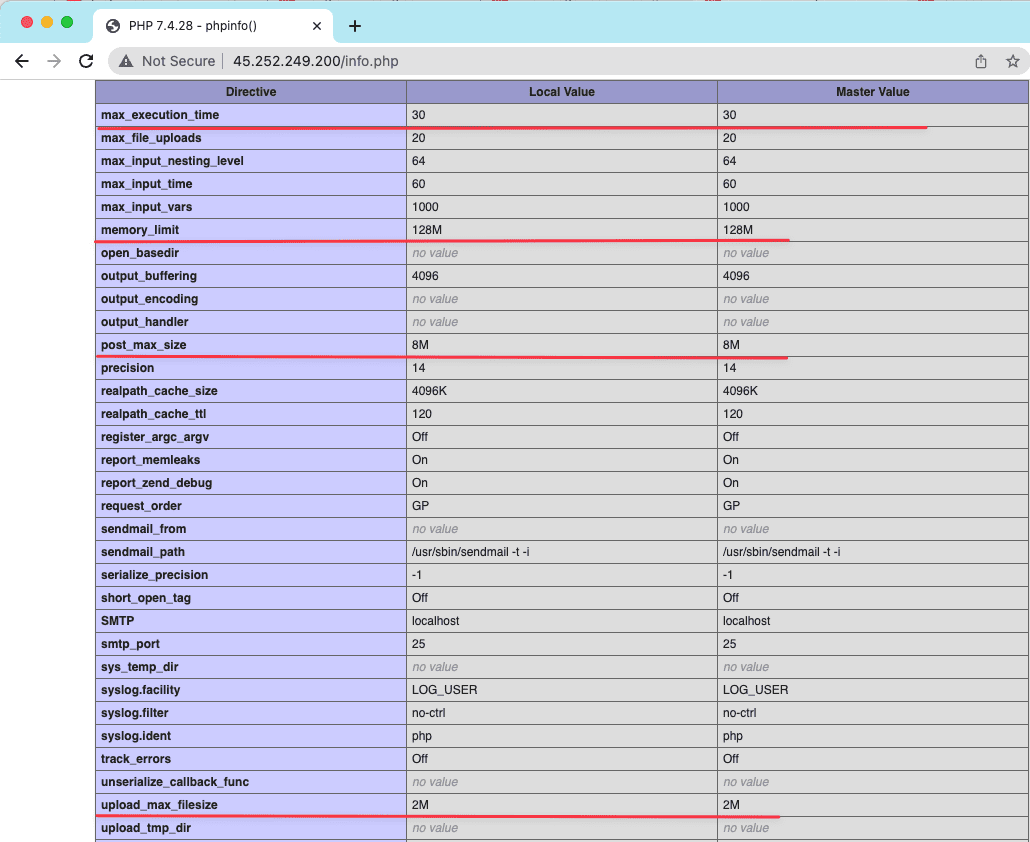 Now open your browser and visit http://<IP-Addressem>/info.php to check the current PHP parameters.