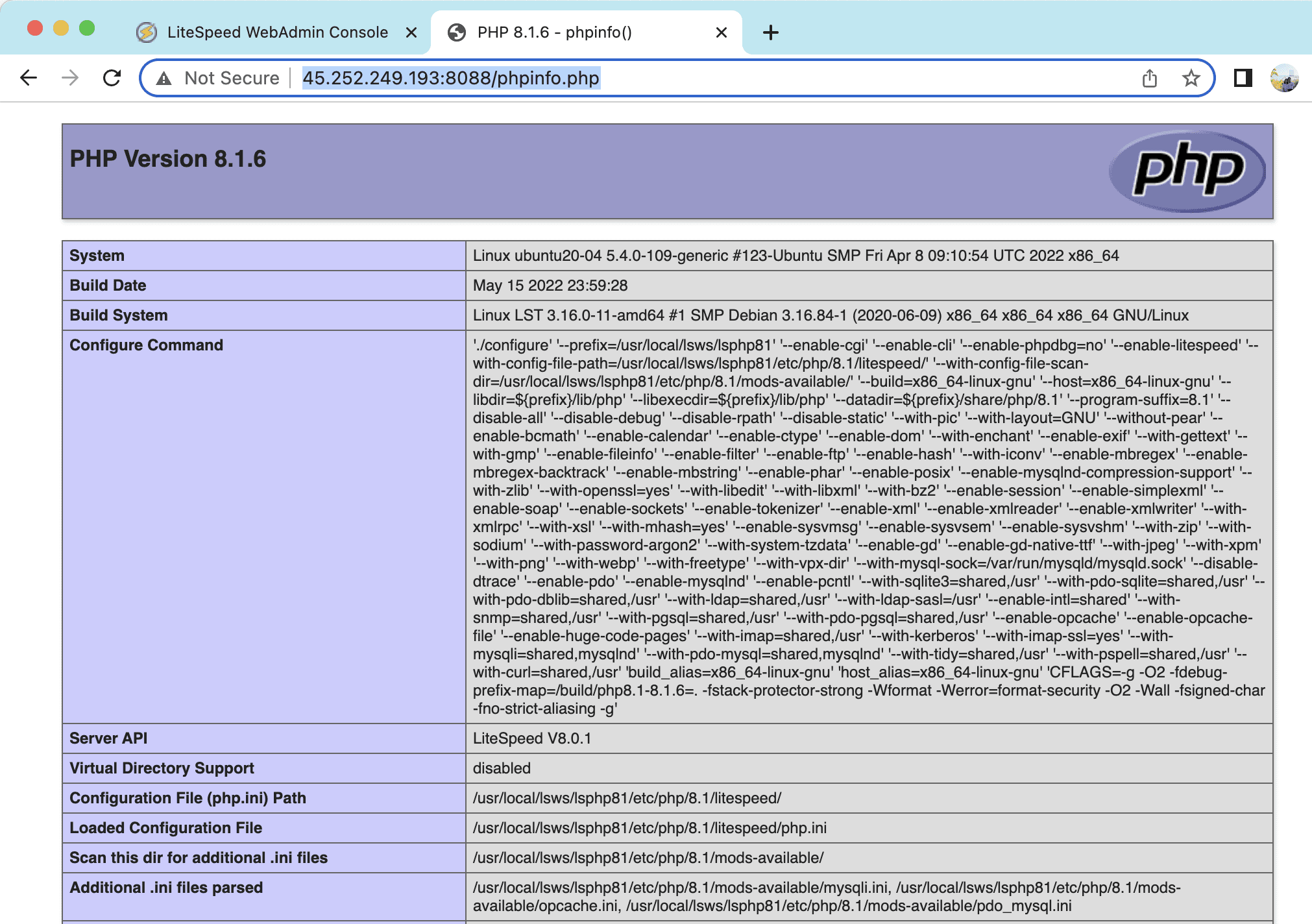 Now go to your browser and follow the link http://IP_Server:8088/info.php to check if the PHP version has been specified correctly. If the browser displays as below, it is successful.
