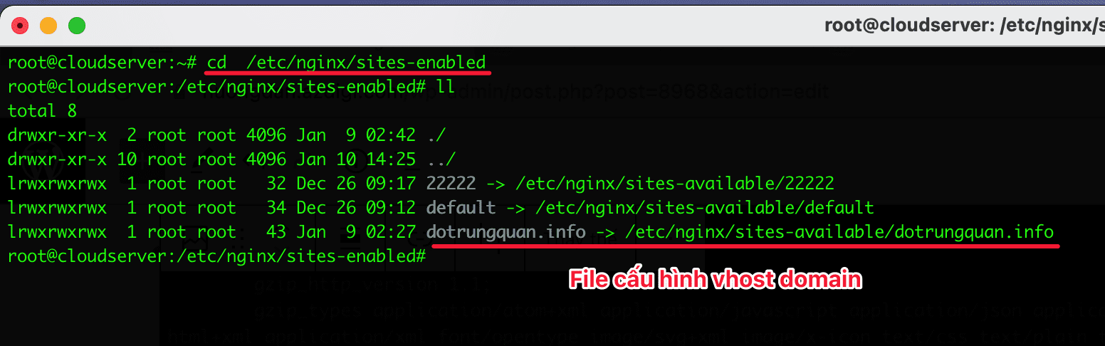 You can access this directory with the cd command. Once you enter the directory, the command ll hoặc ls -l, it will list the files inside. Here you will see the domain configuration files, open the corresponding domain file to check the paths to save the SSL certificate.