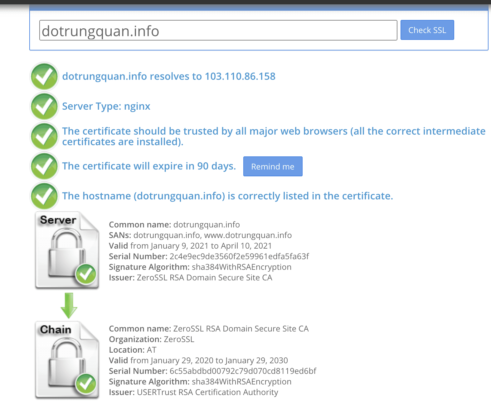 To install SSL, the first condition is that you must point the domain name to the Hosting/VPS IP. I have a domain dotrungquan.info and pointed to the VPS IP to install Webinoly. To check if the domain name has been pointed to the server, you can check it online at dnswatch.info