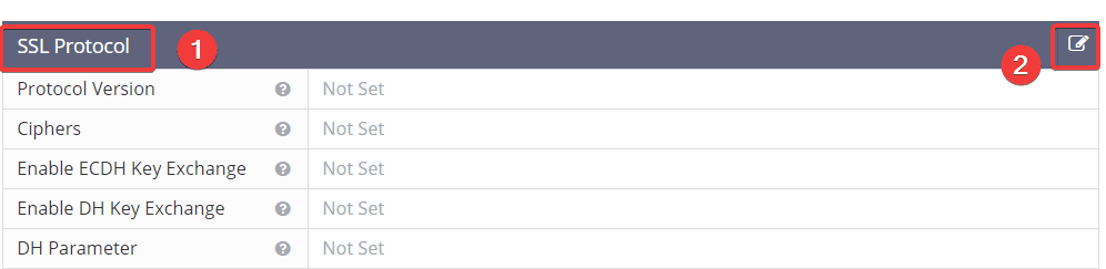 Next, click on the SSL tab (1) => click Edit (2) to edit the SSL Private Key & Certificate section.