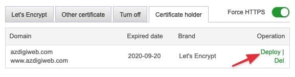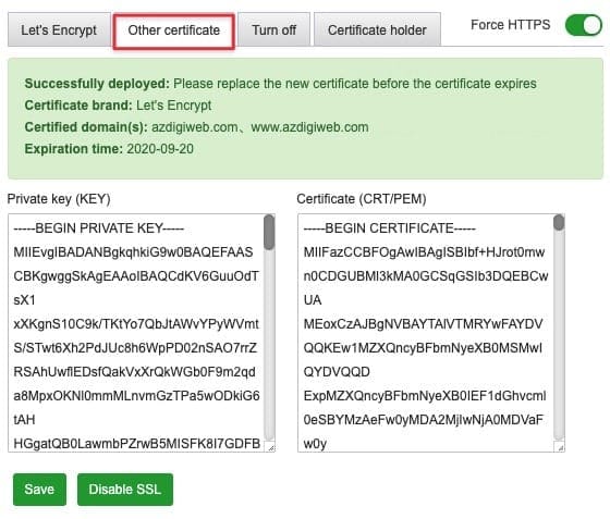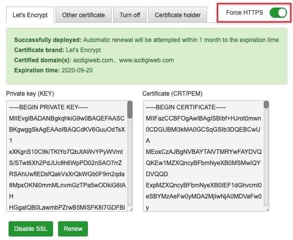 Once done, it will display a message with detailed information about the certificate’s expiration date, as well as the private key and certificate. At this point, you should enable Force HTTPS so that the website automatically switches back to HTTPS protocol when accessing the browser.
