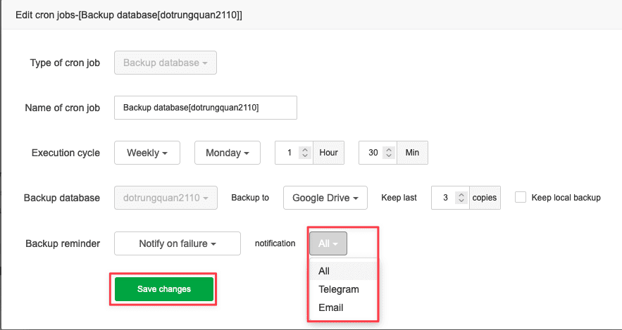 Here you choose the cron job you want to receive notifications. In this article, I will choose cron backup Database to Google Drive. And there will be 2 items for you to choose, including:
