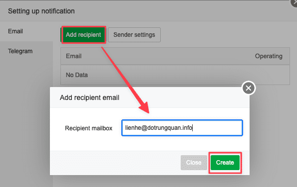 Next, you need to set up a mail recipient account (Add recipient). This is the account that receives the warning information.