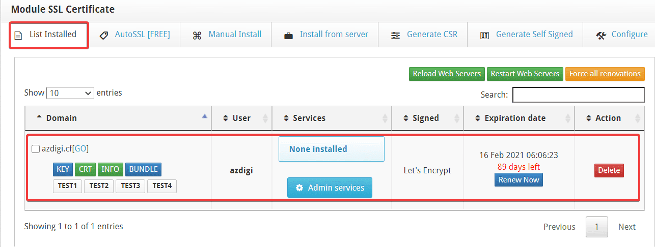 At the User interface, you access Domains => AutoSSL => Domain/Subdomain (choose the right domain to install). After selecting, click Install to perform the installation.