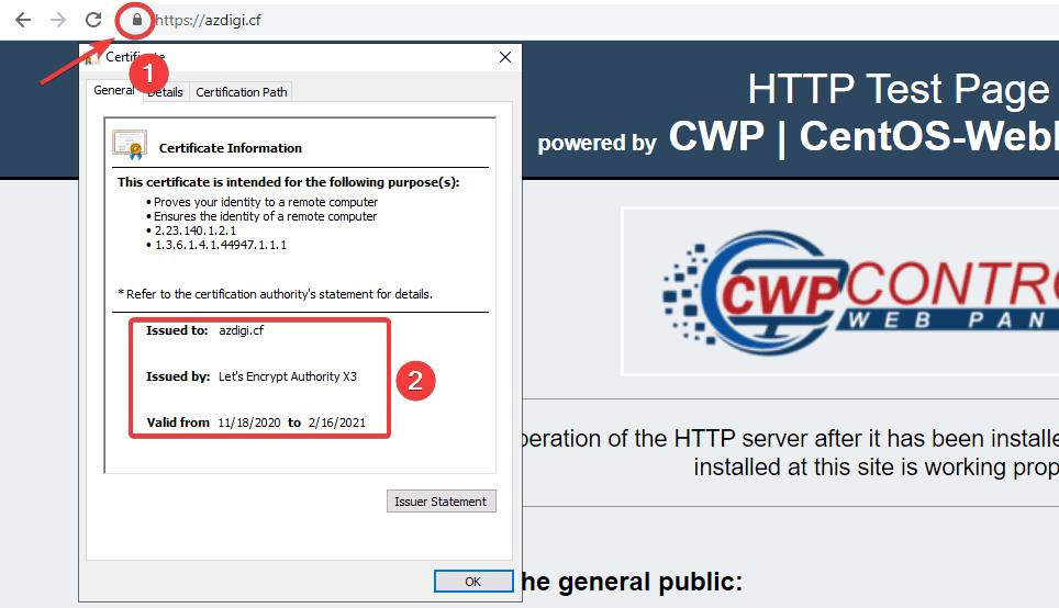 You can access your website in a browser and click on the padlock icon as shown below to check. It will display which company’s certificate the website uses and specify the issue date and expiration date.