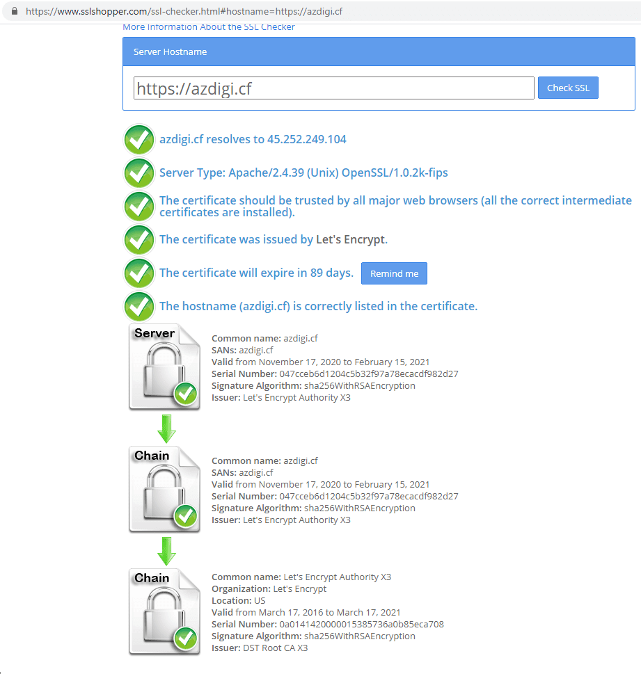 Then you enter your domain and click Check SSL. At this point, all information about the website’s certificate will be fully displayed as below: